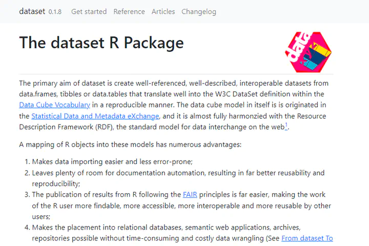 The primary aim of dataset is create well-referenced, well-described, interoperable datasets from data.frames, tibbles or data.tables that translate well into the W3C DataSet definition within the Data Cube Vocabulary in a reproducible manner. The data cube model in itself is is originated in the Statistical Data and Metadata eXchange, and it is almost fully harmonzied with the Resource Description Framework (RDF), the standard model for data interchange on the web[^1].